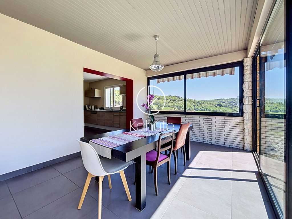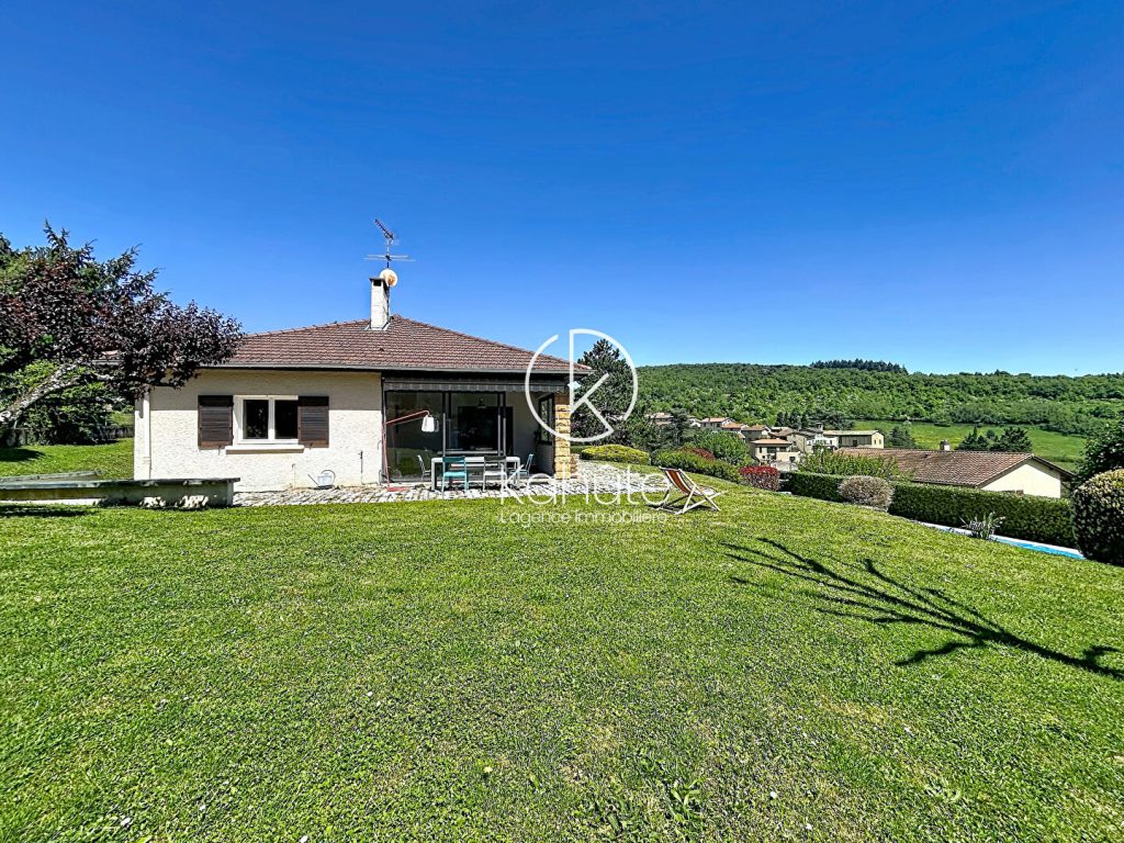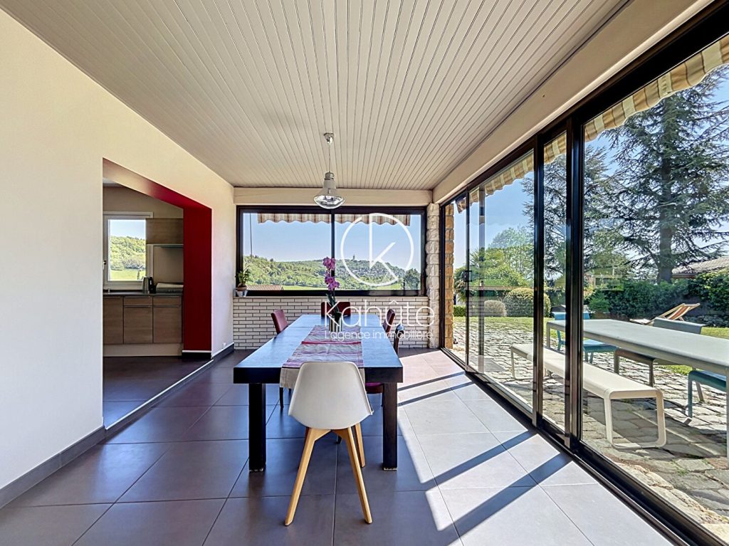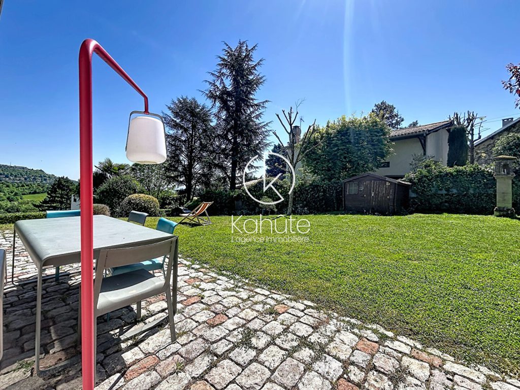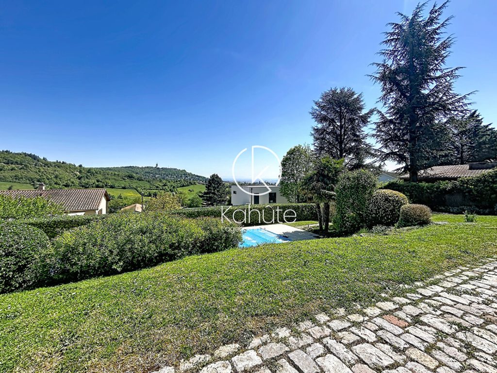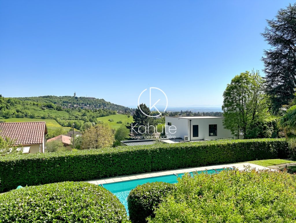 A l’extérieur, le jardin paysagé, parfaitement entretenu, dévoile plusieurs espaces de vie : une vaste terrasse dominant un panorama remarquable sur le Mont Cindre, Lyon et, par temps clair, la chaîne des Alpes ; un espace piscine ( 5×10 ) intimiste en contrebas, ainsi que de larges surfaces engazonnées propices à la détente. Le tout dans un cadre préservé, sans aucun vis-à-vis.